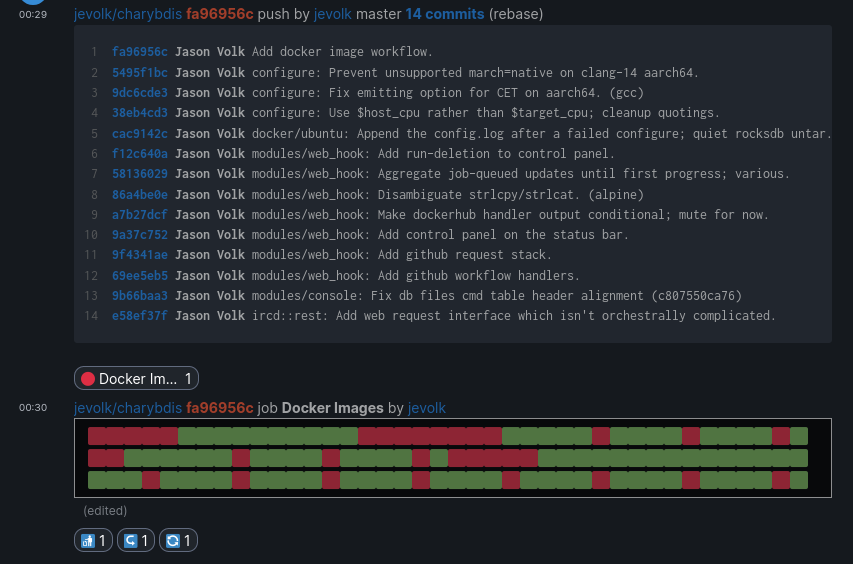 Construct features a Github webhook bot built into the server as a loadable module. This is something which existed from the very first days of the project and something I've worked on intermittently. For those that don't remember shortly after reactions were released in Riot, Construct was the first to make use of them as status indicators for continuous integration by reacting with π‘ and π’. Sometime later we were one-upped by the creativity of the folks over at #nheko whose bot sends a very baroque set of reactions for individual Gitlab jobs.